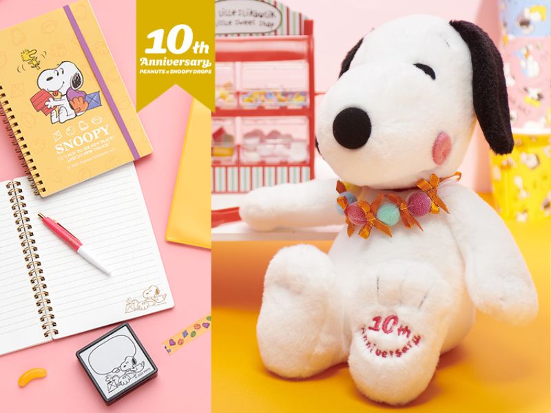Celebrate the app game SNOOPY DROPS’ 10th anniversary with a limited-edition plush Snoopy. This adorable figure features a candy necklace and weighted bottom for stability. Its ears shimmer in the light!