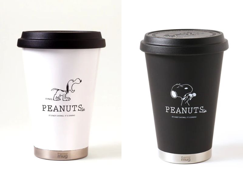 The black thermos features Joe Cool, while the white thermos has a barking Snoopy and includes a drink voucher!
