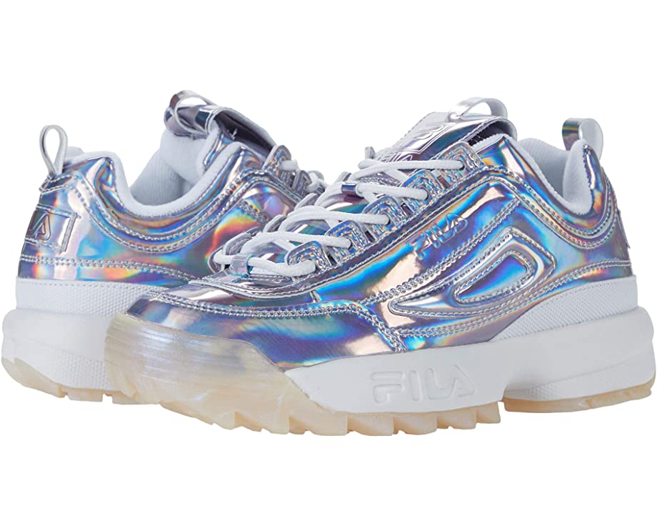 超级夺目的运动鞋,不同光线打在鞋上也会有不一样的色彩。用上镭射色为主色,配上半透明的鞋底,十分适合今年的復古风潮!