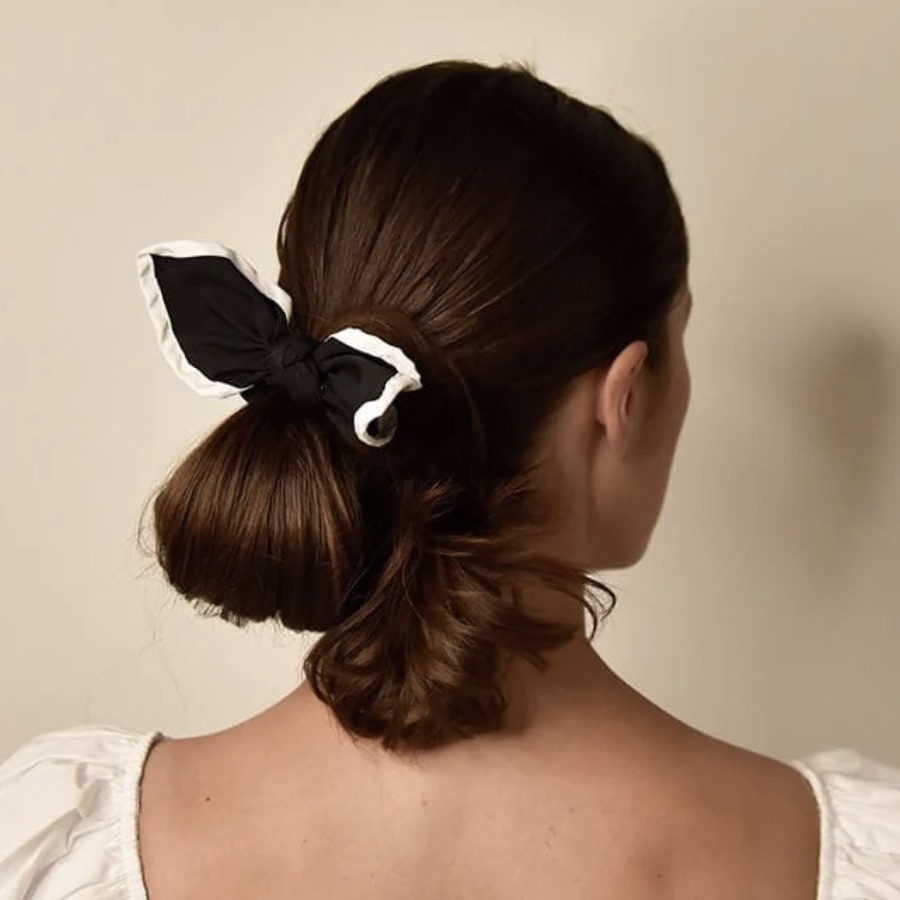 The L. Erickson Bow Scrunchie features a bow, one black with white trim, and one white with black trim. These scrunchies are ideal for any hair type, and add an elegant spin on damage free hair ties!